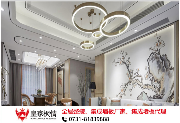 皇家枫情集成墙板还具有中式风格、美式风格、地中海式风格,从硬装到软装配饰,墙面到地面,客厅到餐厅,卧室到书房,厨房到阳台,天地墙全方位全屋整装配置,家居装修、家具、家电、灯饰、配饰一站式全面定制全包服,实现一体化整装、豪装、精装。